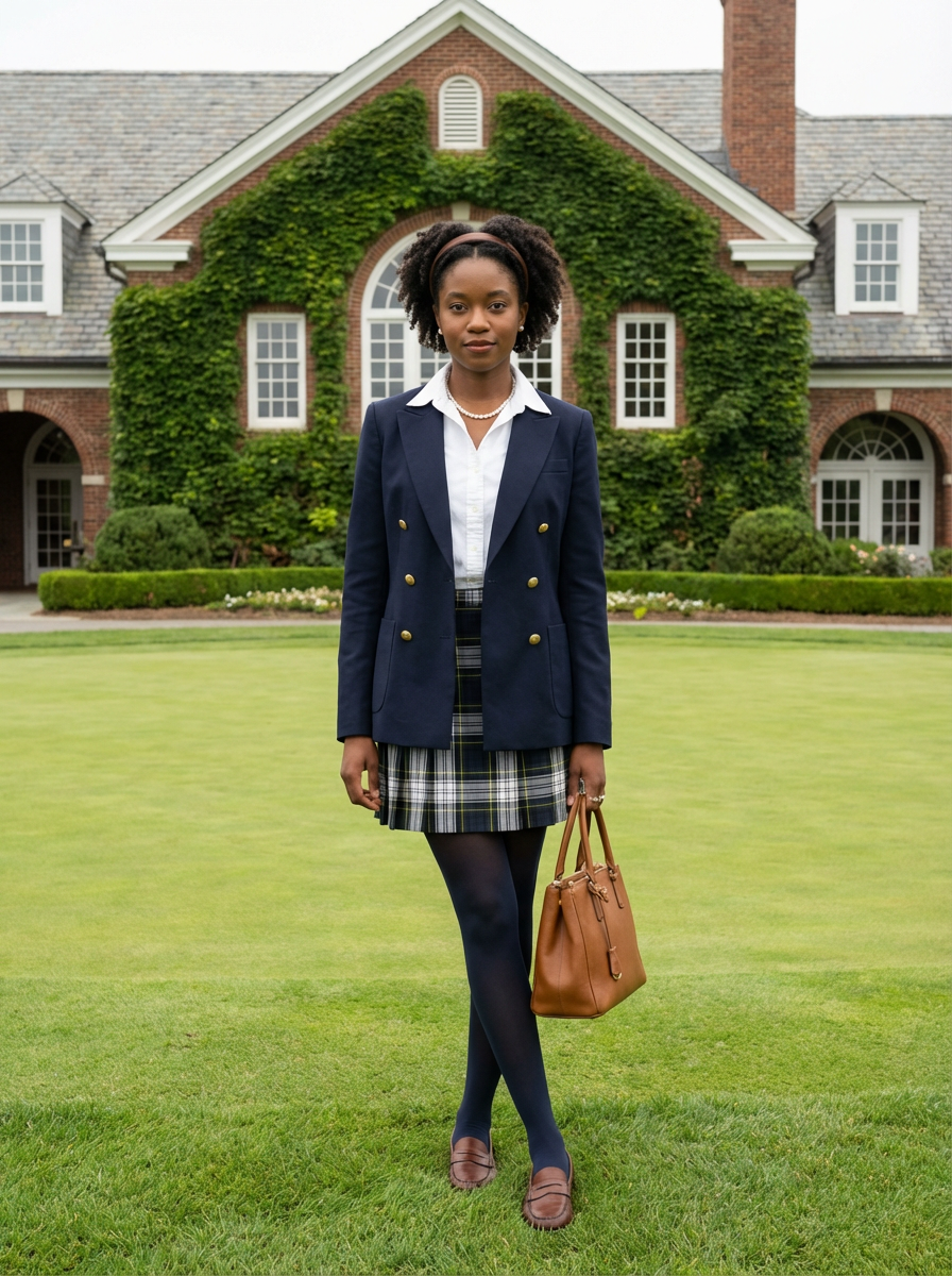 a model in preppy style, old money aesthetic, posh style, elite school stlye, luxurious style, gossip girl neo-prep style, ralph lauren style, country club style, ivy league style