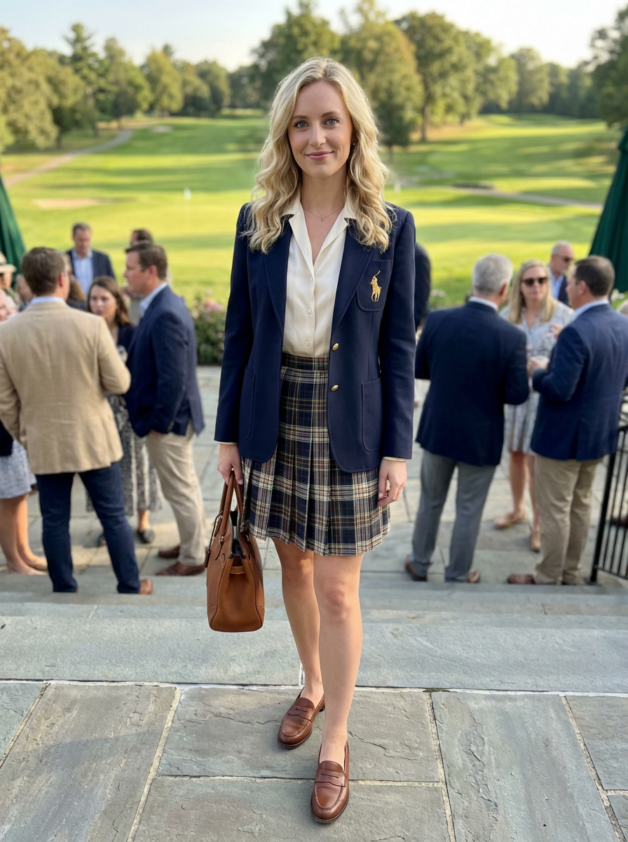 a model in preppy style, old money aesthetic, posh style, elite school stlye, luxurious style, gossip girl neo-prep style, ralph lauren style, country club style, ivy league style