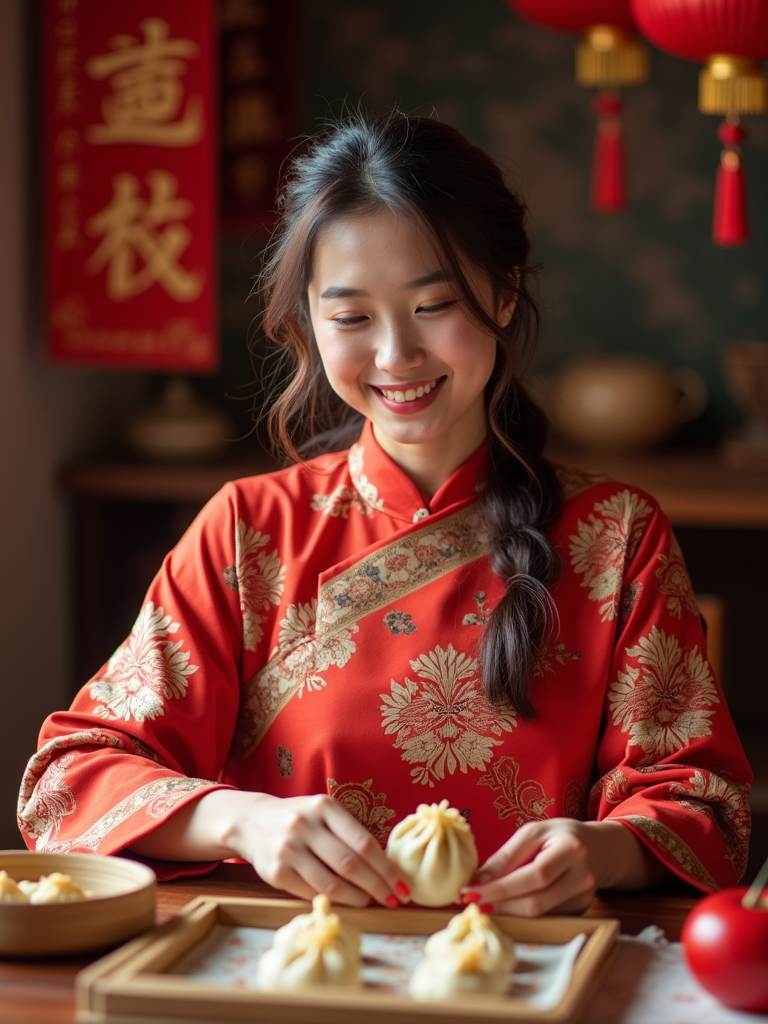 a model in traditional attire during Chinese New Year, sharing homemade dumplings with family , capturing the generous and family-oriented spirit of the Spring Festival