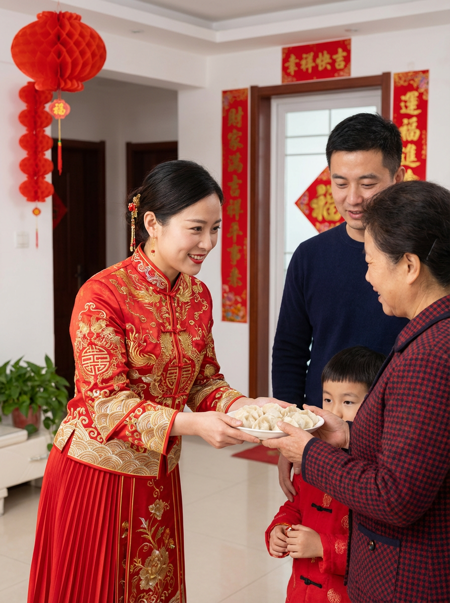 a model in traditional attire during Chinese New Year, sharing homemade dumplings with family , capturing the generous and family-oriented spirit of the Spring Festival