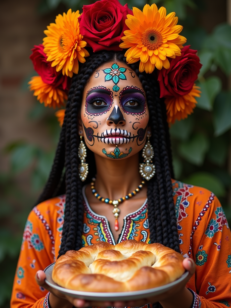 a model in traditional attire during Día de los Muertos, sharing pan de muerto with family , capturing the celebratory and family-oriented spirit of honoring ancestors