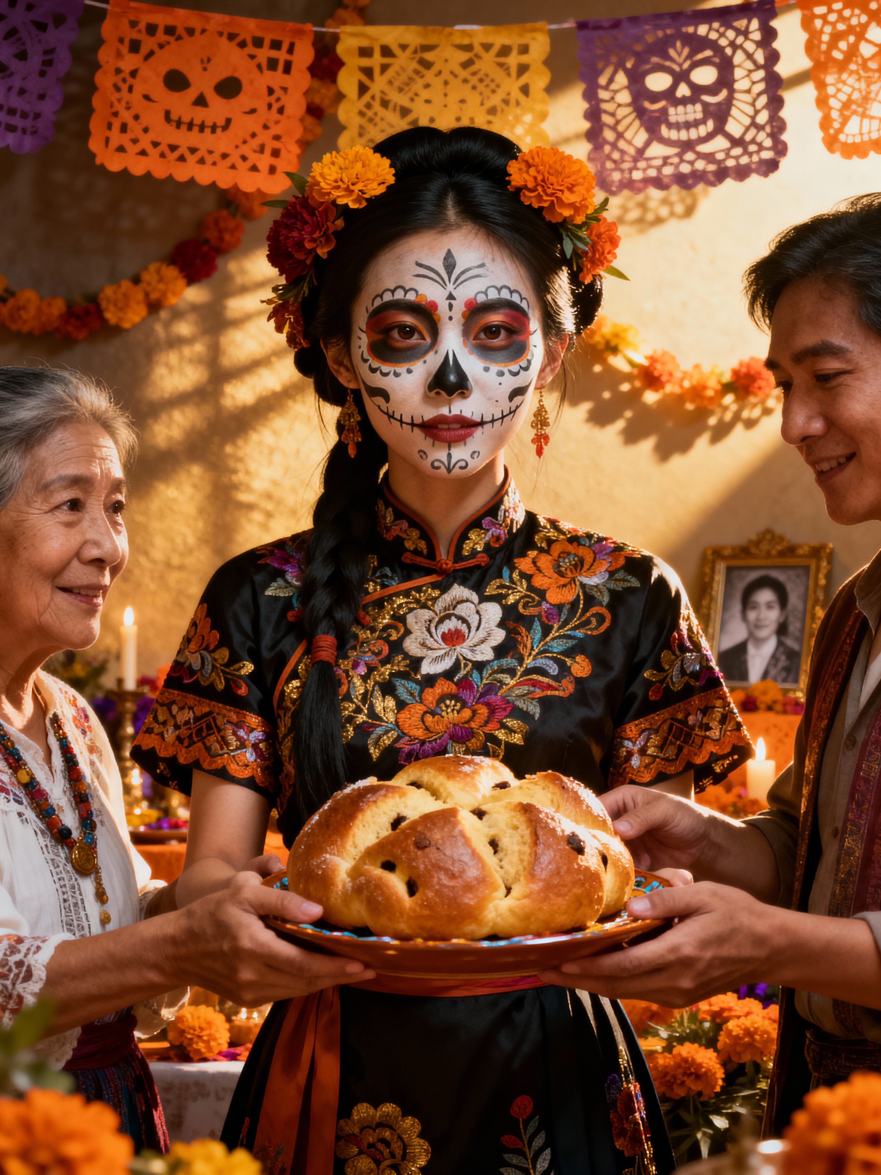 a model in traditional attire during Día de los Muertos, sharing pan de muerto with family , capturing the celebratory and family-oriented spirit of honoring ancestors