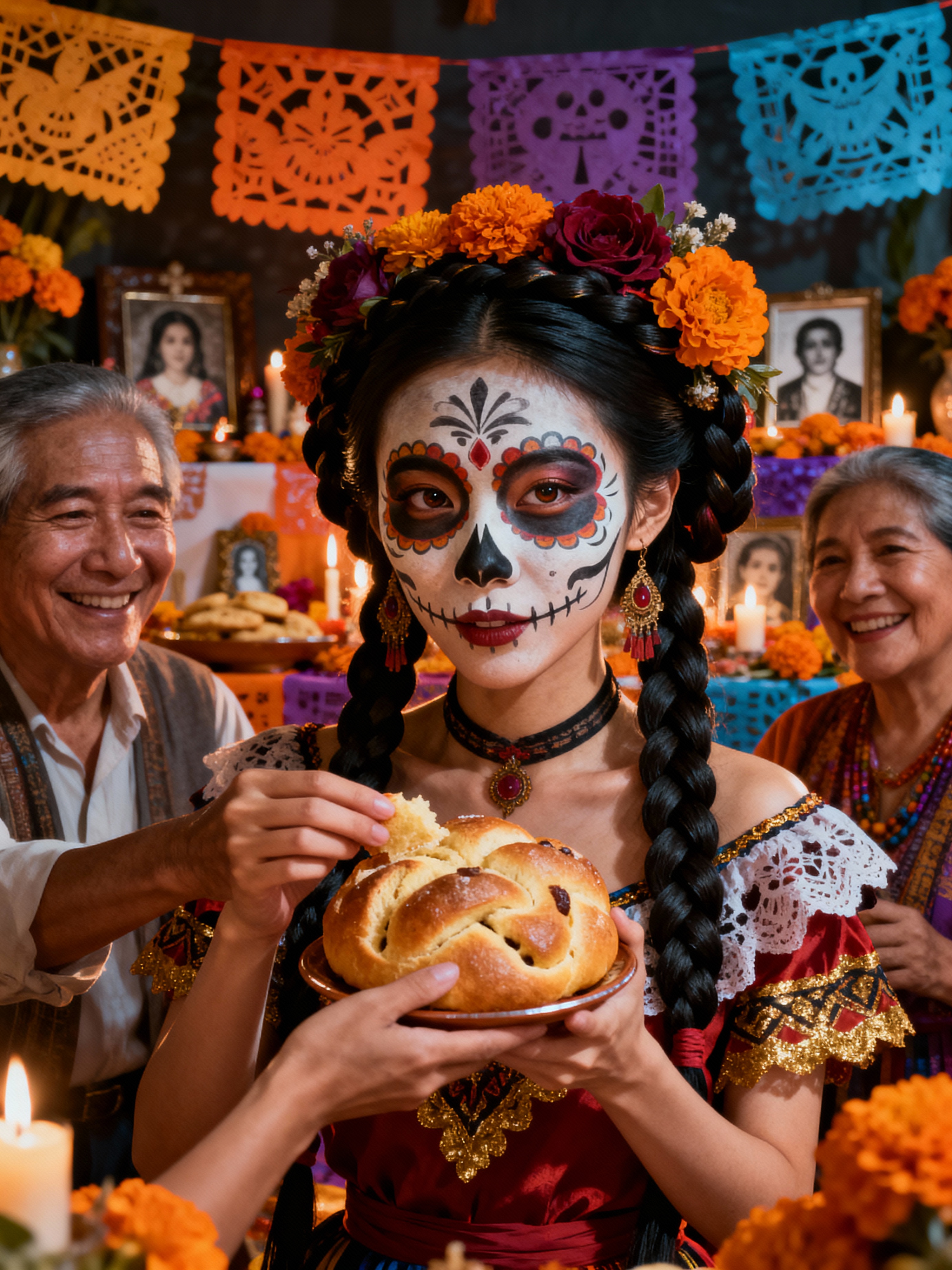 a model in traditional attire during Día de los Muertos, sharing pan de muerto with family , capturing the celebratory and family-oriented spirit of honoring ancestors