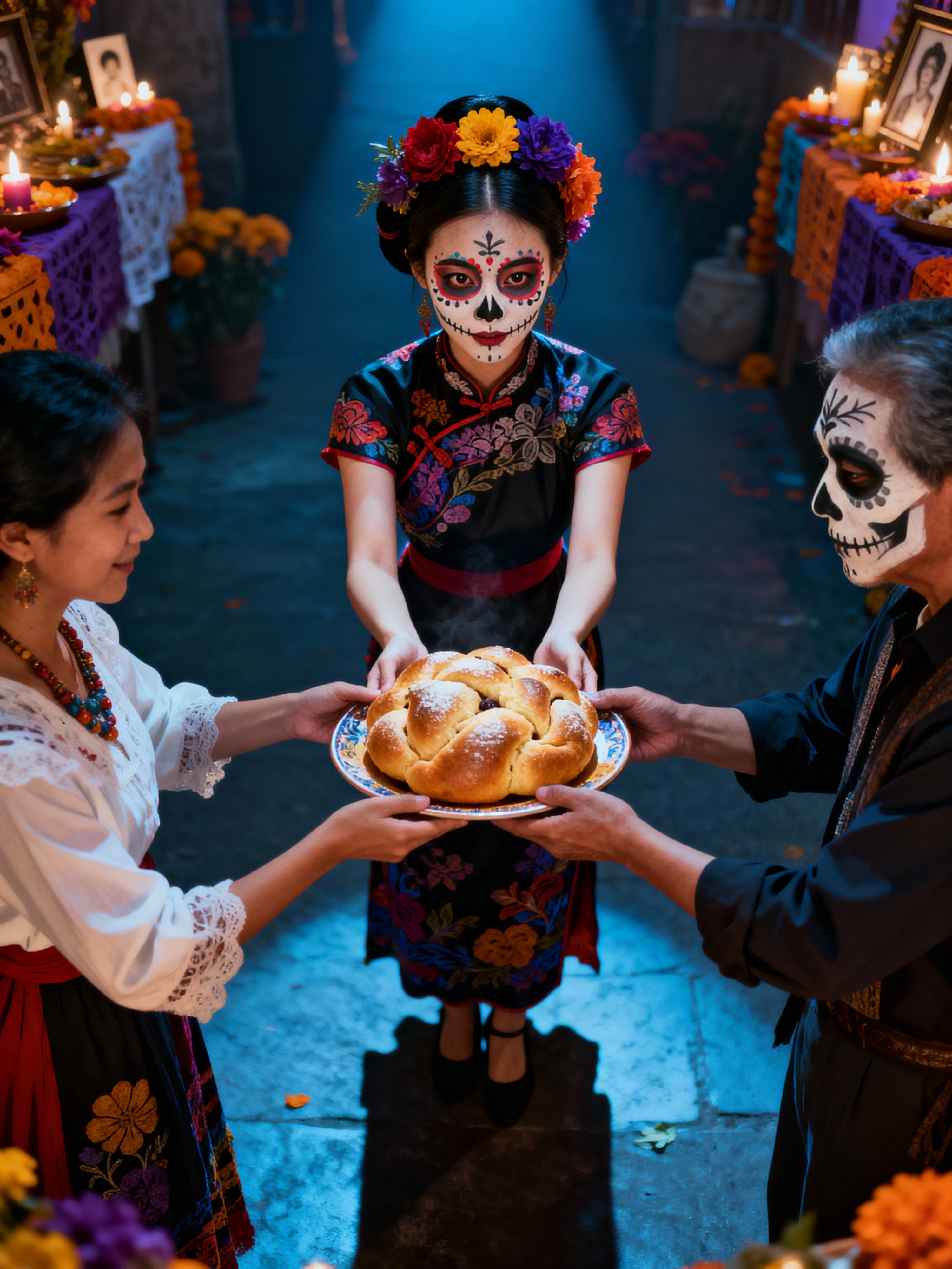 a model in traditional attire during Día de los Muertos, sharing pan de muerto with family , capturing the celebratory and family-oriented spirit of honoring ancestors
