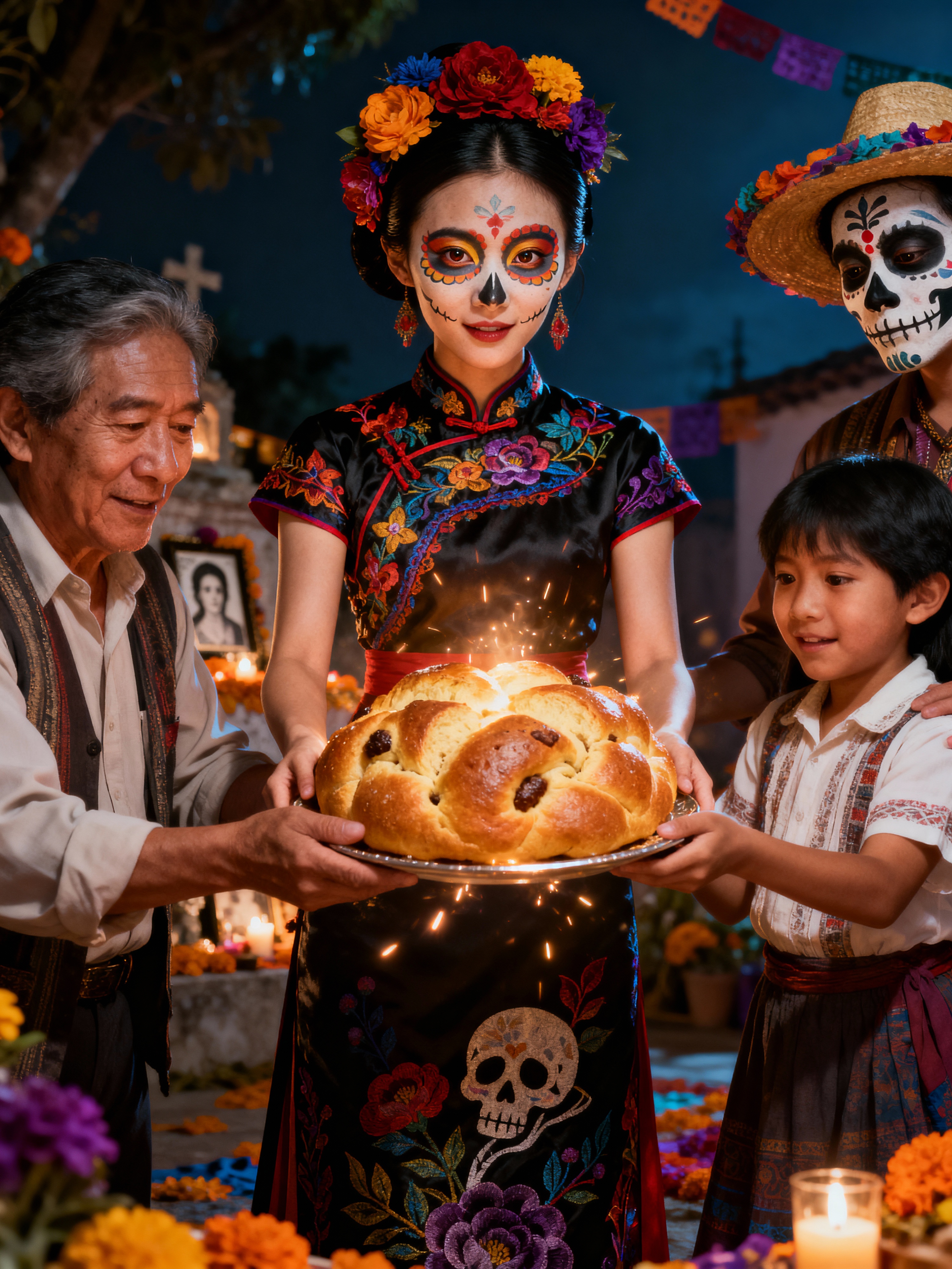 a model in traditional attire during Día de los Muertos, sharing pan de muerto with family , capturing the celebratory and family-oriented spirit of honoring ancestors