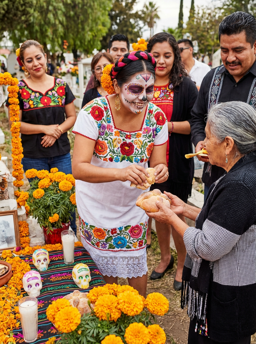 a model in traditional attire during Día de los Muertos, sharing pan de muerto with family , capturing the celebratory and family-oriented spirit of honoring ancestors