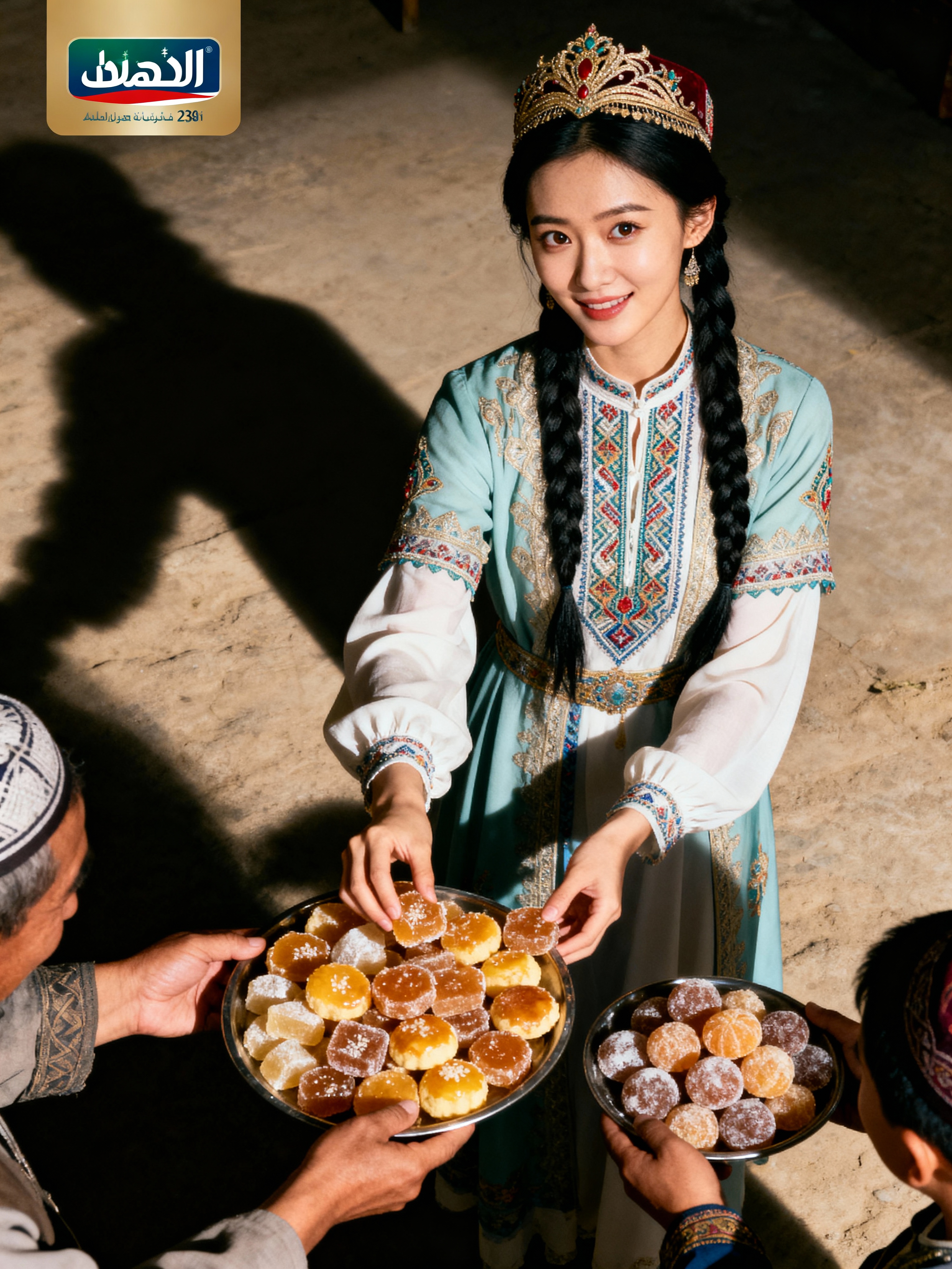 a model in traditional attire during Eid, sharing homemade sweets with family , capturing the generous and community spirit of the holiday