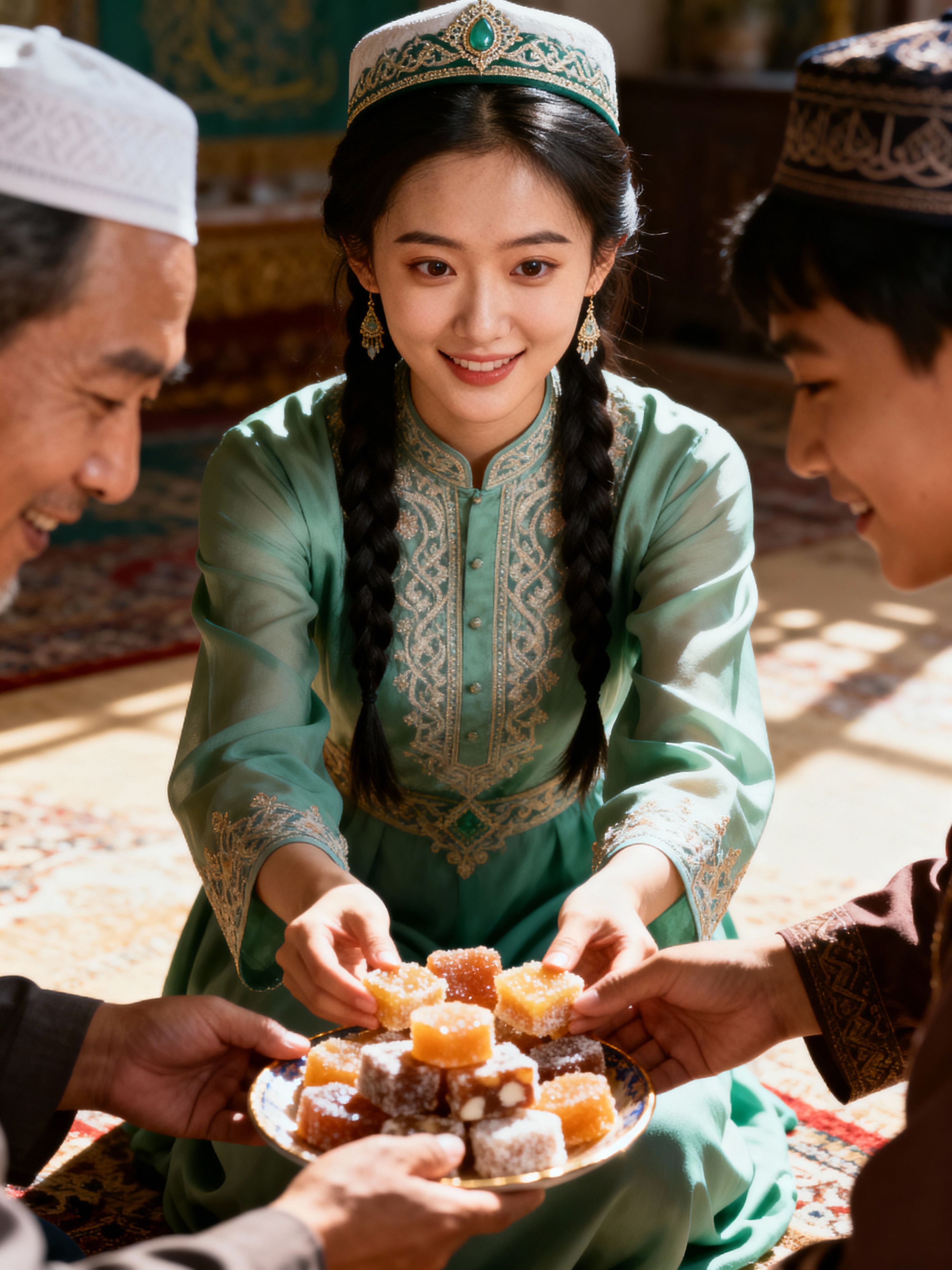 a model in traditional attire during Eid, sharing homemade sweets with family , capturing the generous and community spirit of the holiday