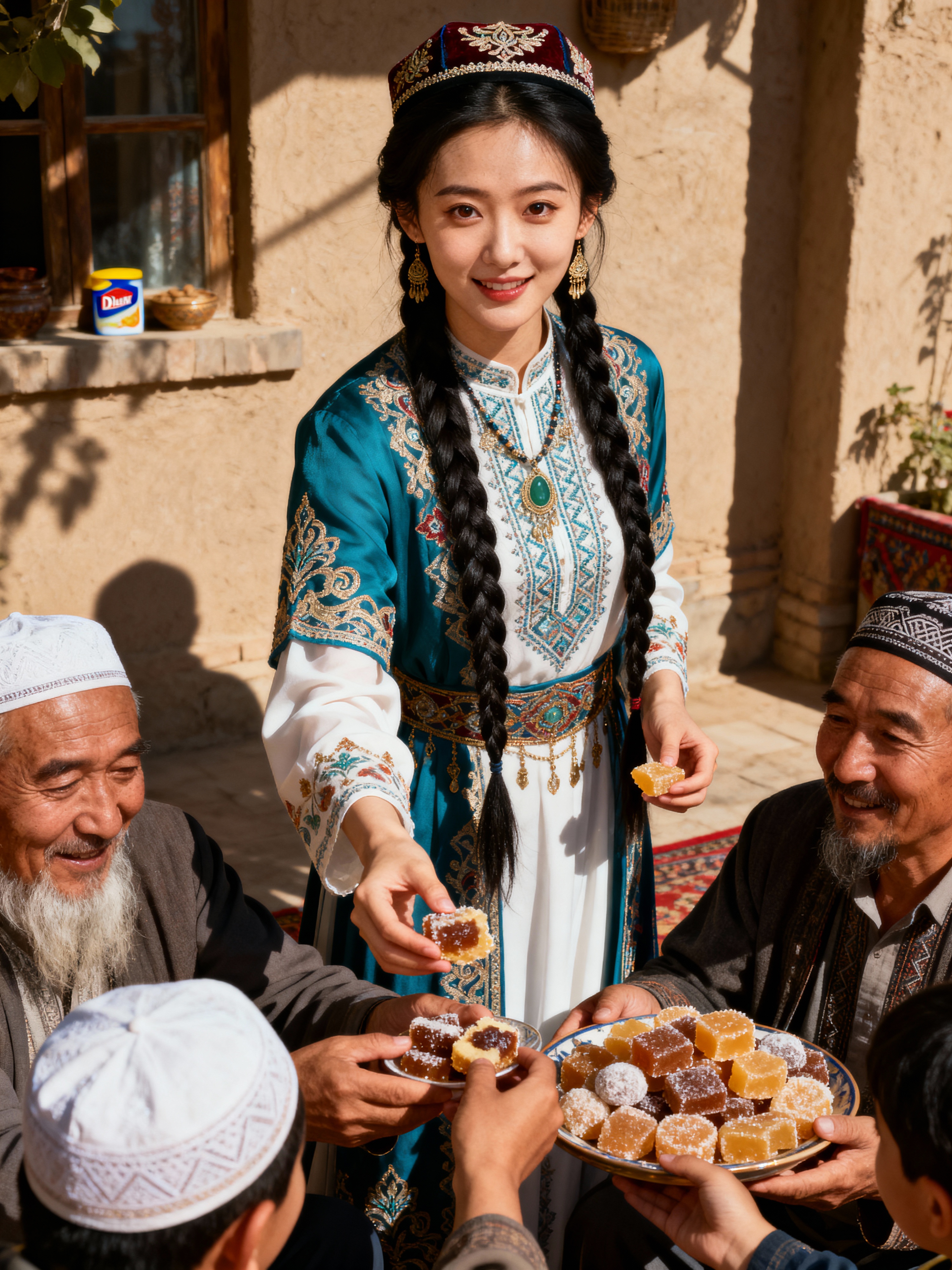 a model in traditional attire during Eid, sharing homemade sweets with family , capturing the generous and community spirit of the holiday