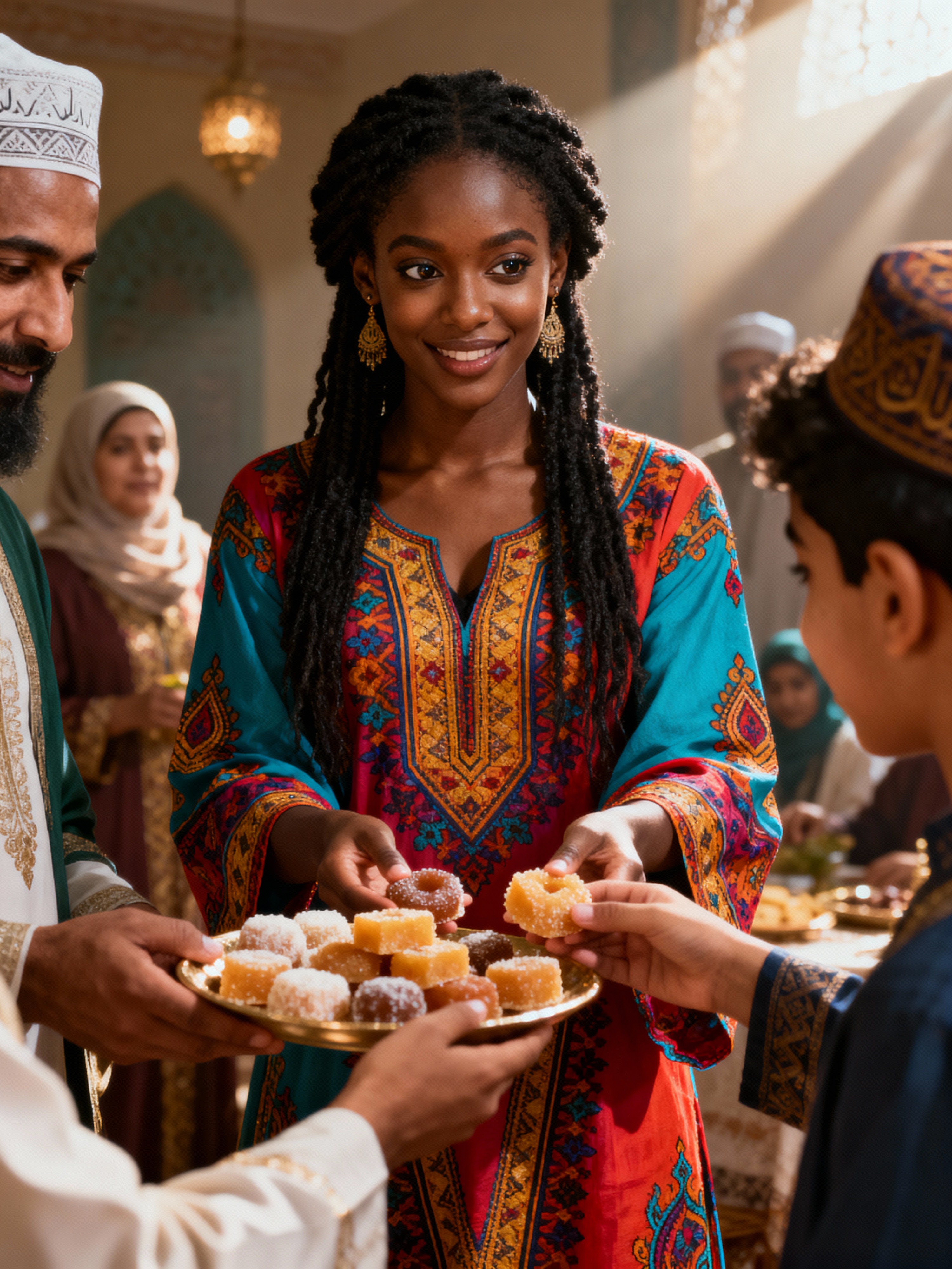 a model in traditional attire during Eid, sharing homemade sweets with family , capturing the generous and community spirit of the holiday