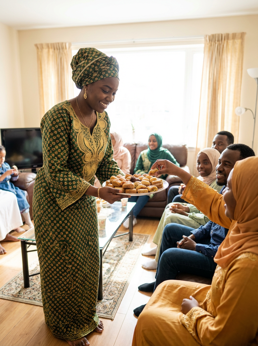 a model in traditional attire during Eid, sharing homemade sweets with family , capturing the generous and community spirit of the holiday