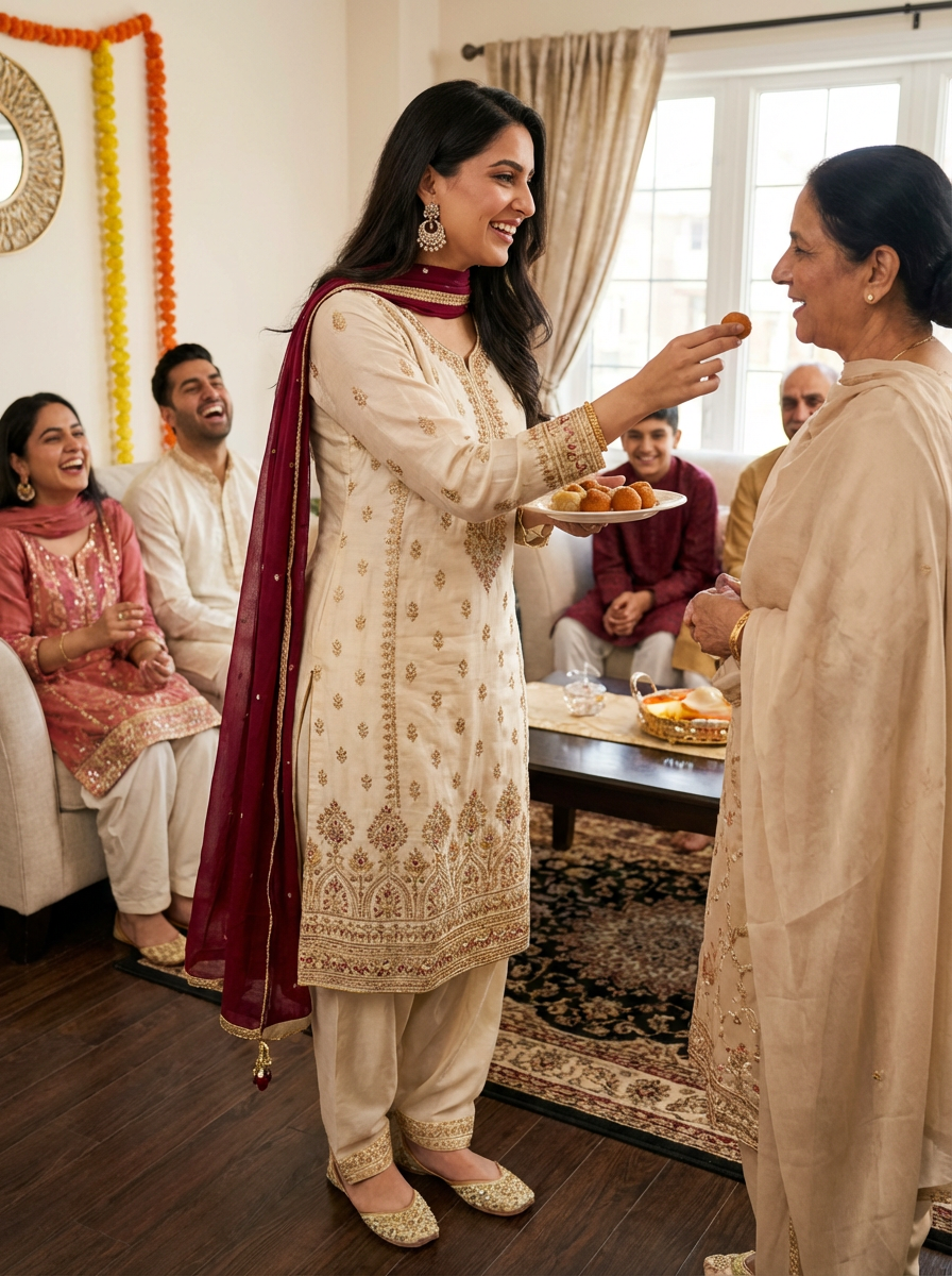 a model in traditional attire during Eid, sharing homemade sweets with family , capturing the generous and community spirit of the holiday