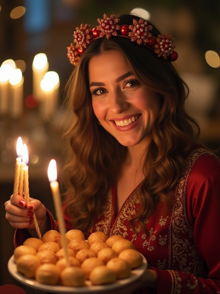 a model in traditional attire during Hanukkah, sharing homemade sufganiyot with family , capturing the generous and family-oriented spirit of the Festival of Lights