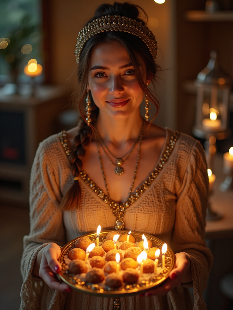 a model in traditional attire during Hanukkah, sharing homemade sufganiyot with family , capturing the generous and family-oriented spirit of the Festival of Lights