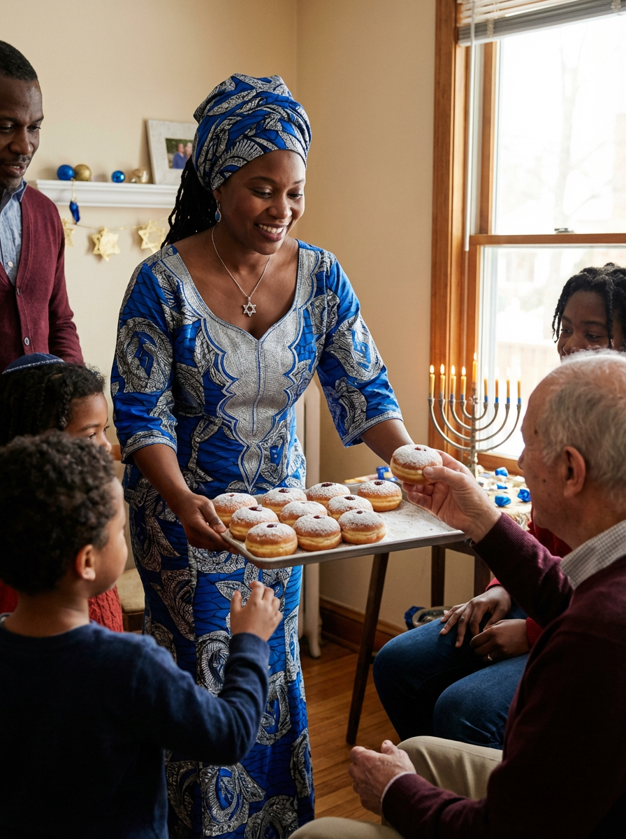 a model in traditional attire during Hanukkah, sharing homemade sufganiyot with family , capturing the generous and family-oriented spirit of the Festival of Lights