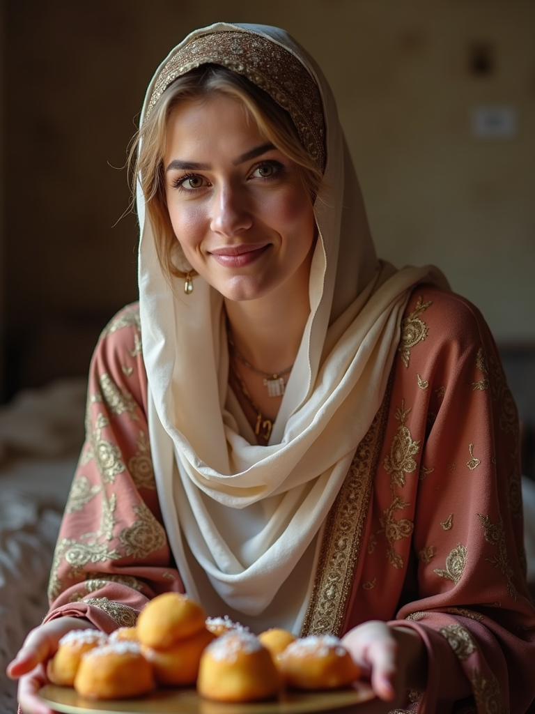 a model in traditional attire during Ramadan, sharing homemade sweets with family , capturing the generous and community spirit of the holy month
