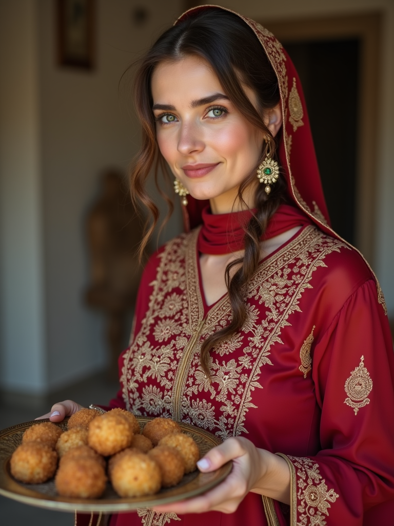 a model in traditional attire during Ramadan, sharing homemade sweets with family , capturing the generous and community spirit of the holy month