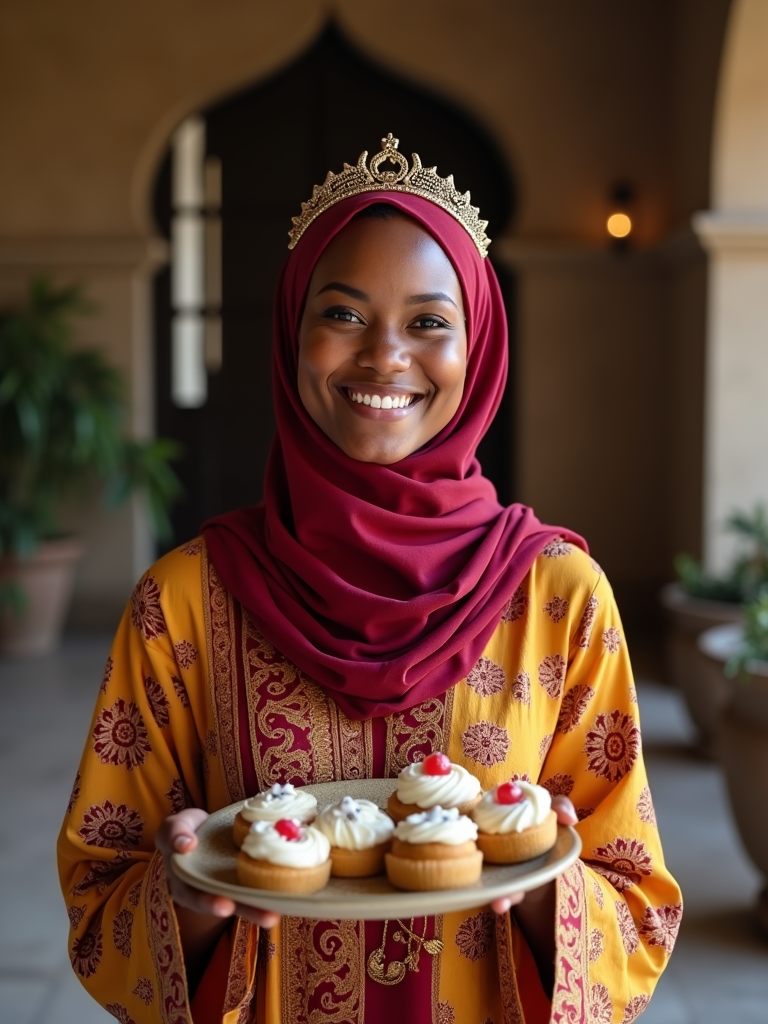 a model in traditional attire during Ramadan, sharing homemade sweets with family , capturing the generous and community spirit of the holy month