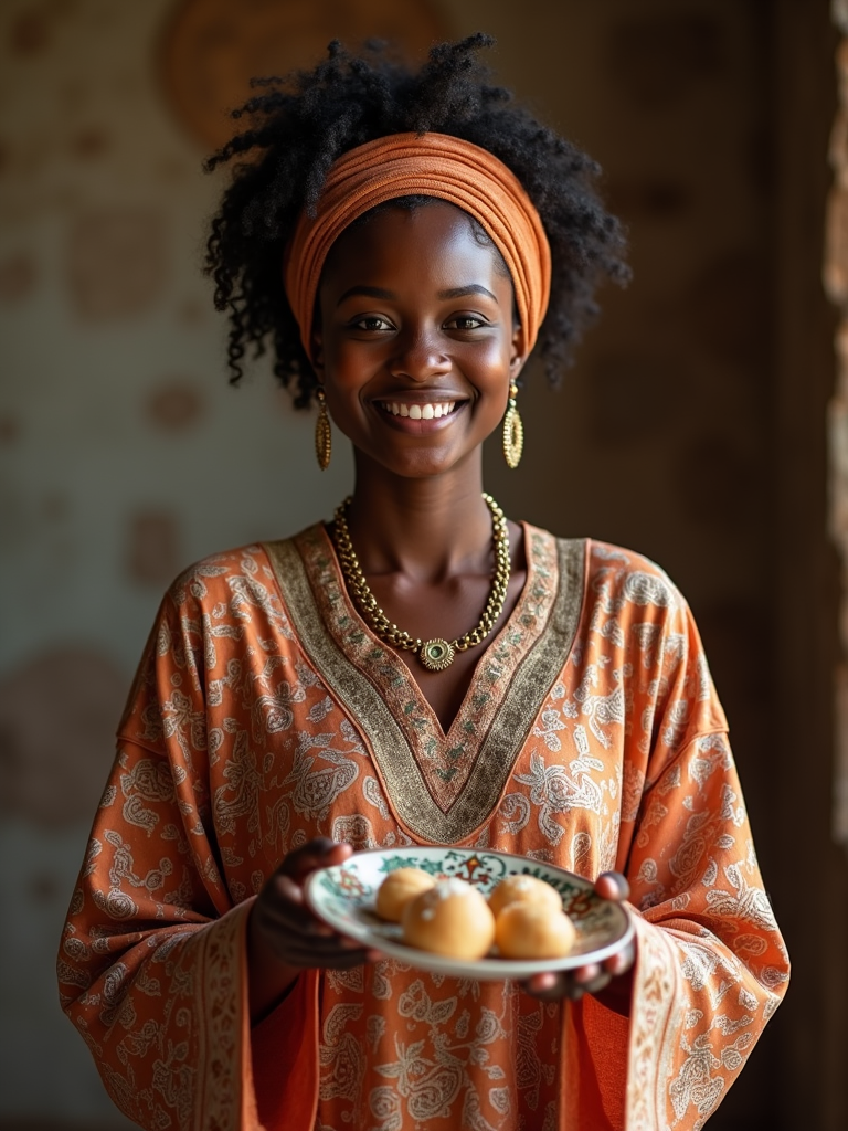 a model in traditional attire during Ramadan, sharing homemade sweets with family , capturing the generous and community spirit of the holy month