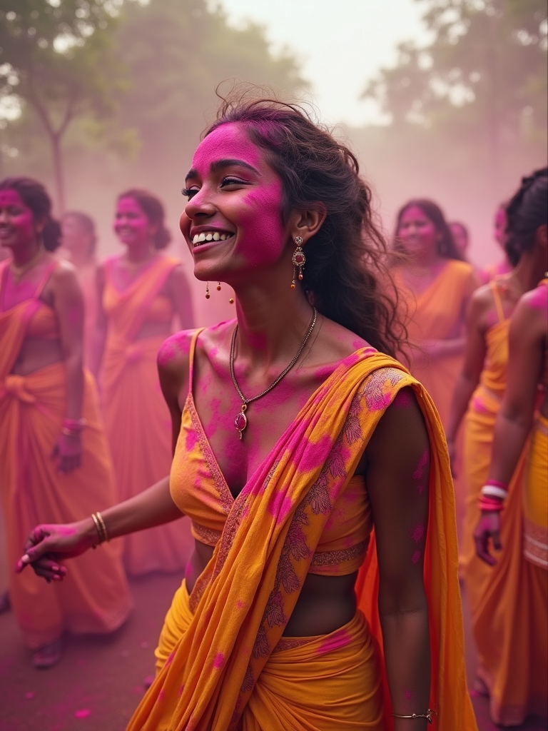 a model in traditional Indian attire splashed with Holi colors, dancing with a group of friends , capturing the energetic and playful atmosphere of the festival