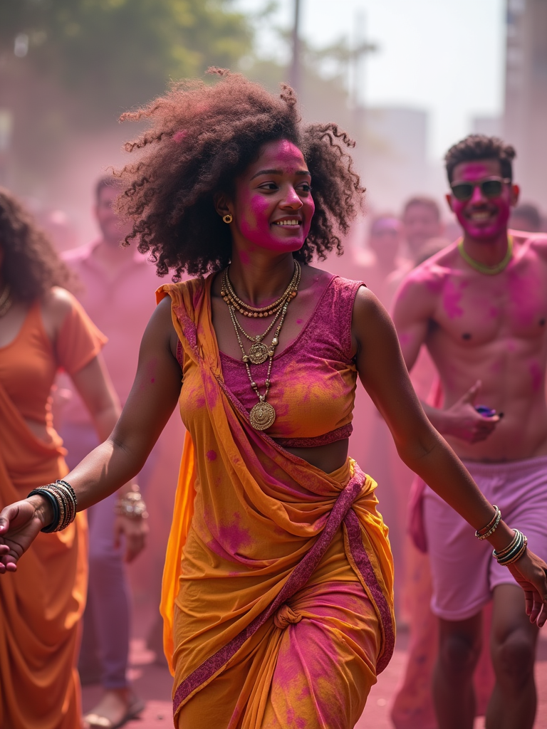 a model in traditional Indian attire splashed with Holi colors, dancing with a group of friends , capturing the energetic and playful atmosphere of the festival