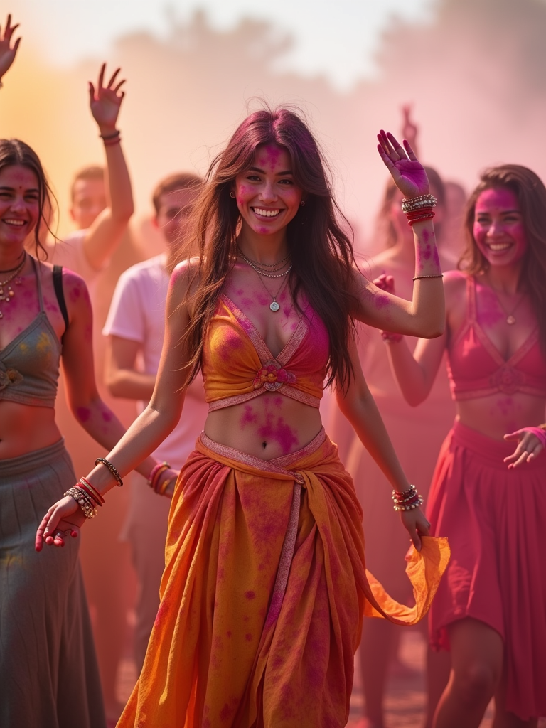 a model in traditional Indian attire splashed with Holi colors, dancing with a group of friends , capturing the energetic and playful atmosphere of the festival