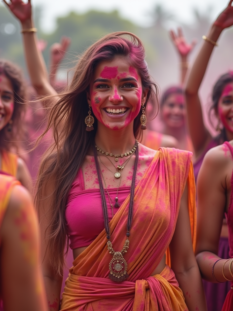 a model in traditional Indian attire splashed with Holi colors, dancing with a group of friends , capturing the energetic and playful atmosphere of the festival