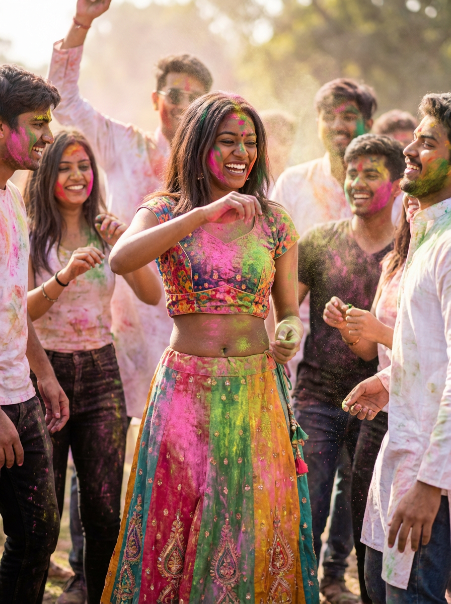 a model in traditional Indian attire splashed with Holi colors, dancing with a group of friends , capturing the energetic and playful atmosphere of the festival