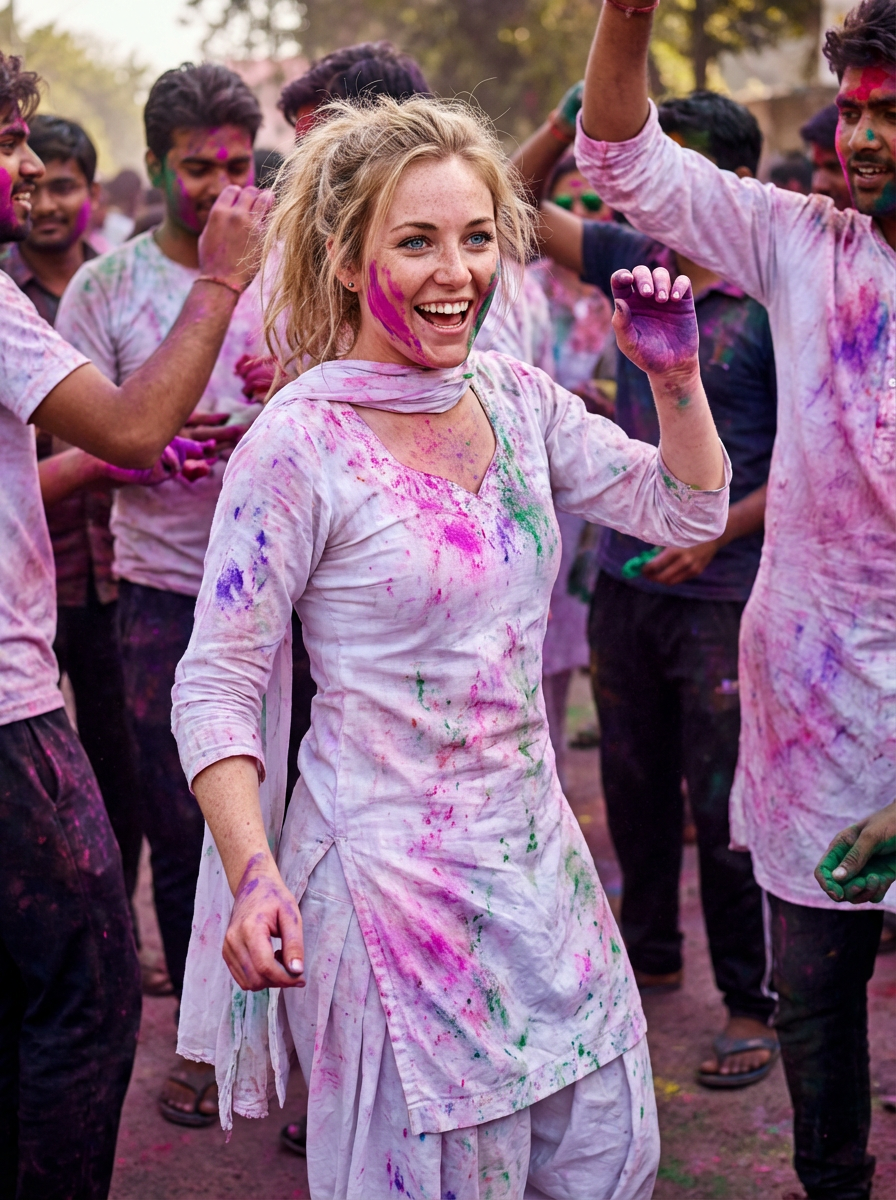 a model in traditional Indian attire splashed with Holi colors, dancing with a group of friends , capturing the energetic and playful atmosphere of the festival