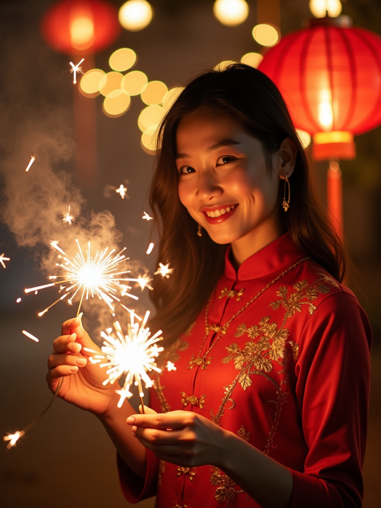 A model lighting sparklers outdoors in a vibrant setting with Diwali decorations like string lights and lanterns.