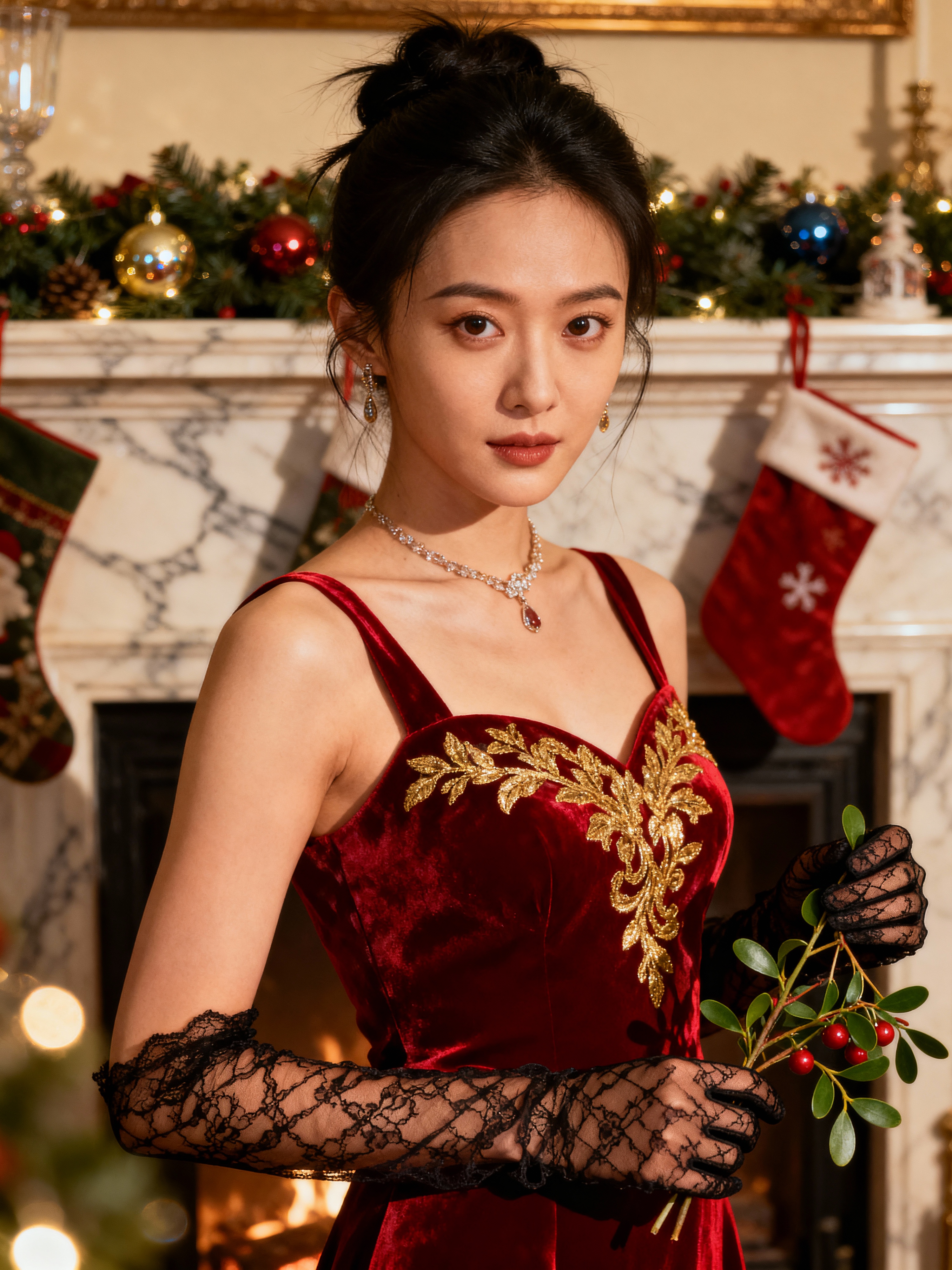A model posing for a Christmas card photo, standing in front of a fireplace with stockings, garland, and holiday decorations.
