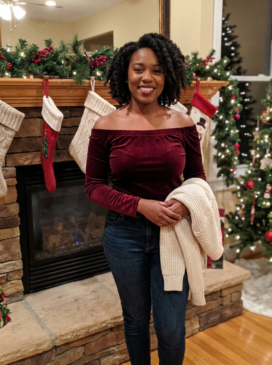 A model posing for a Christmas card photo, standing in front of a fireplace with stockings, garland, and holiday decorations.