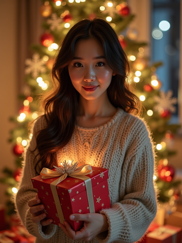A model posing in front of a Christmas tree, holding presents, with snowflakes and festive lights in the background.