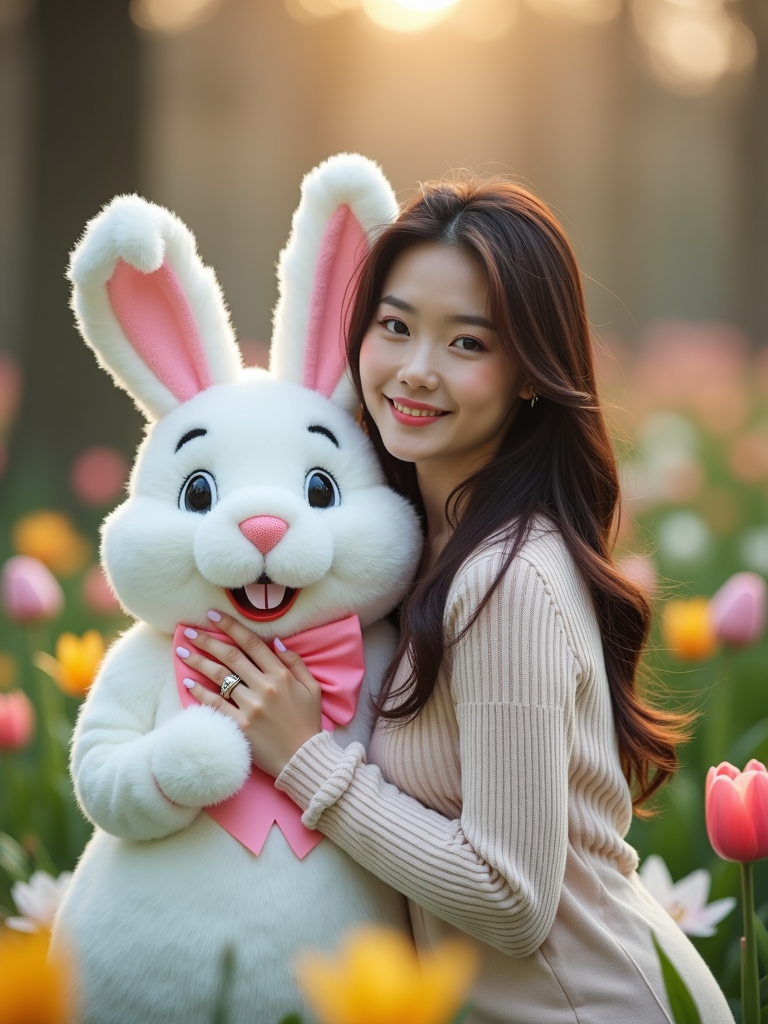 A model posing with an Easter bunny mascot in a garden full of flowers and decorated eggs.