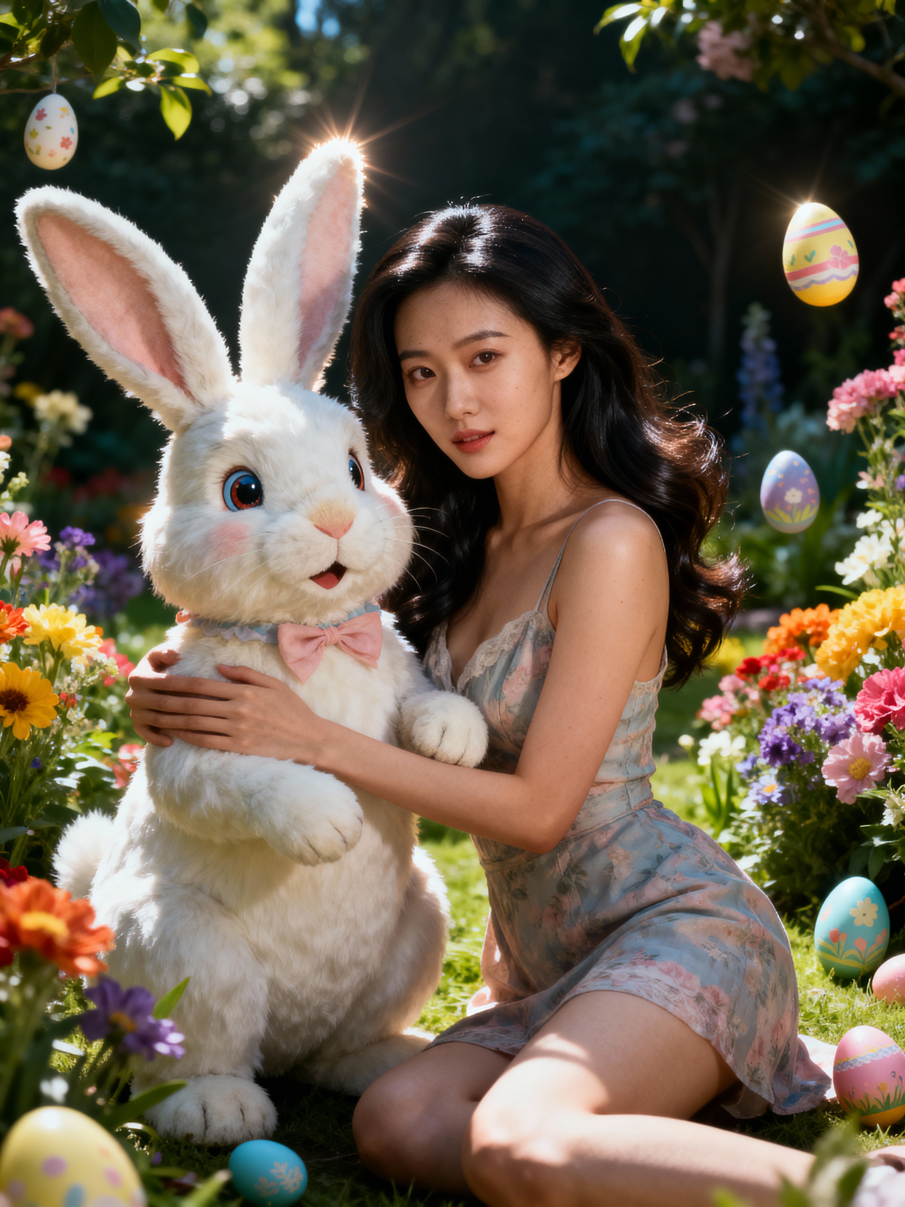 A model posing with an Easter bunny mascot in a garden full of flowers and decorated eggs.