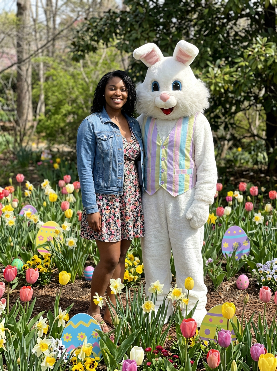 A model posing with an Easter bunny mascot in a garden full of flowers and decorated eggs.