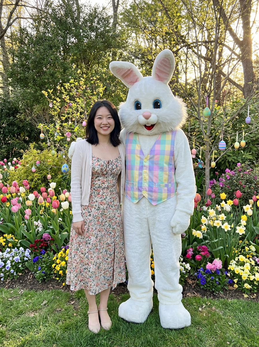 A model posing with an Easter bunny mascot in a garden full of flowers and decorated eggs.