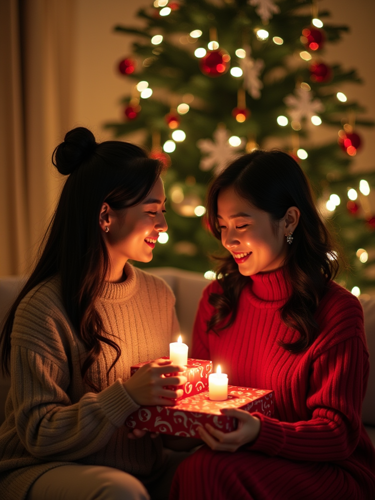 a model sitting together by a decorated christmas tree, exchanging gifts with festive lights and ornaments in the background.