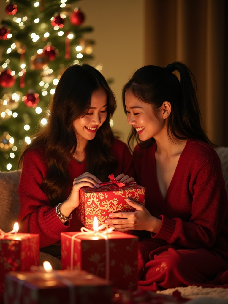 a model sitting together by a decorated christmas tree, exchanging gifts with festive lights and ornaments in the background.