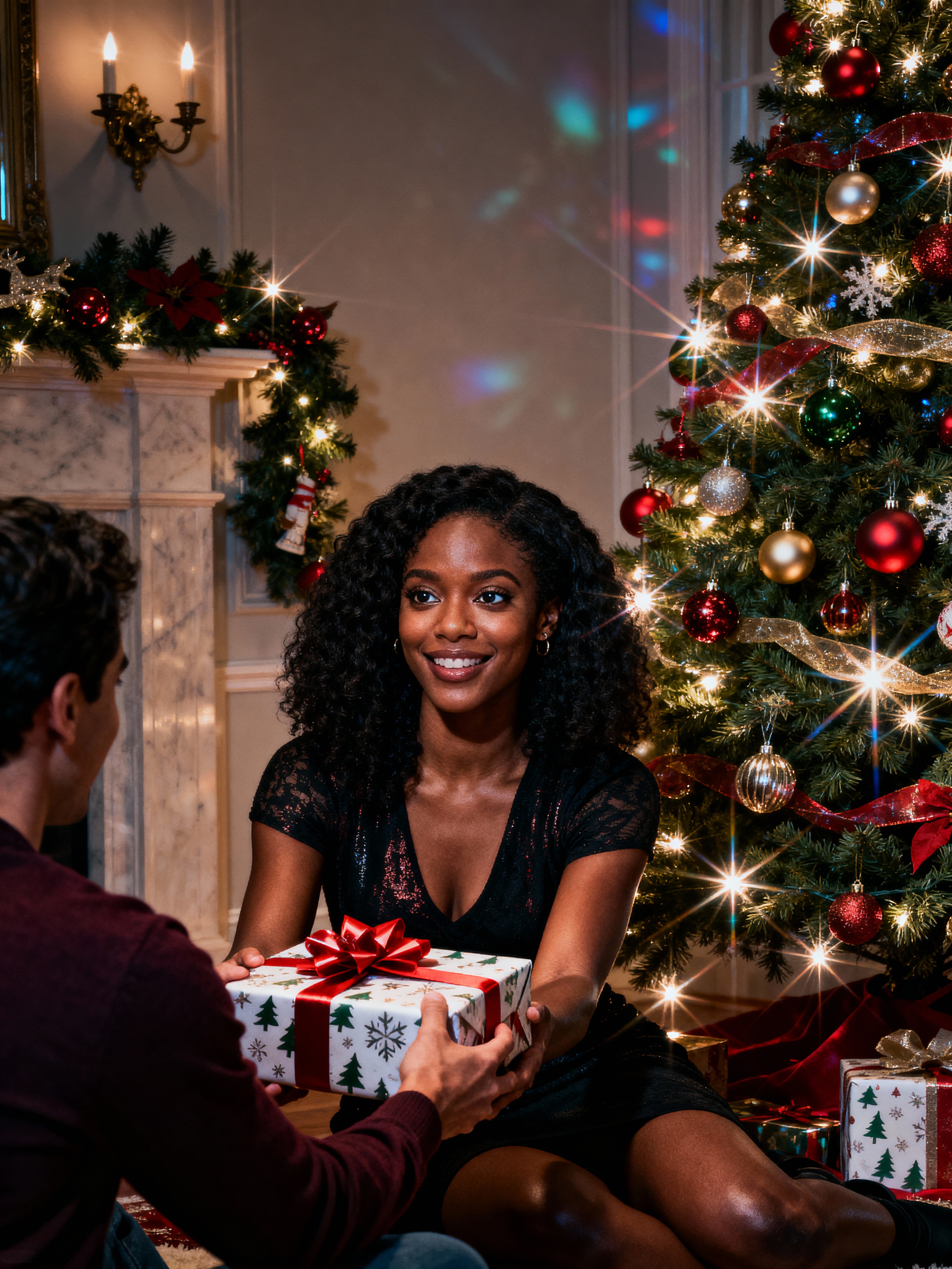 A model sitting together by a decorated Christmas tree, exchanging gifts with festive lights and ornaments in the background.