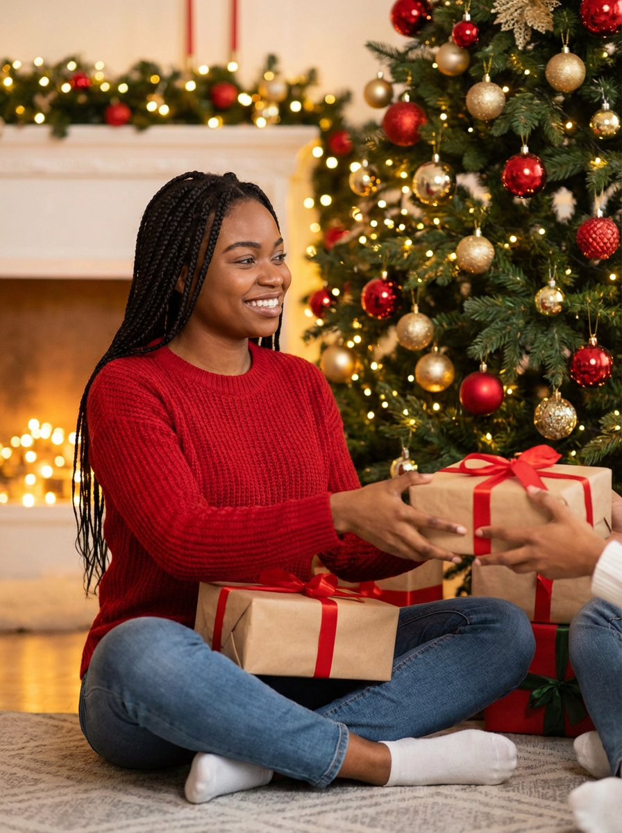 A model sitting together by a decorated Christmas tree, exchanging gifts with festive lights and ornaments in the background.