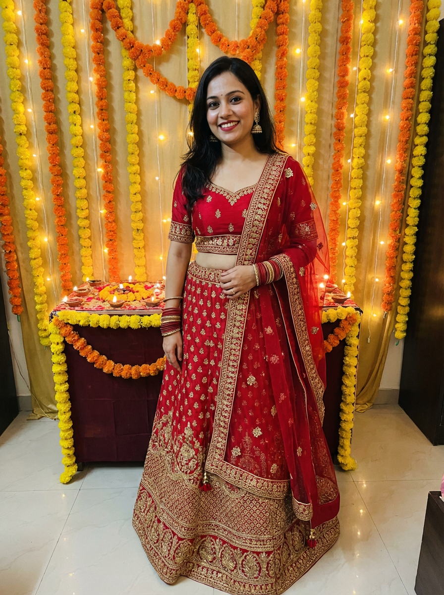 A model standing near a beautifully decorated Diwali backdrop with hanging lights, flowers, and diyas, exuding the festive spirit in a traditional dress.