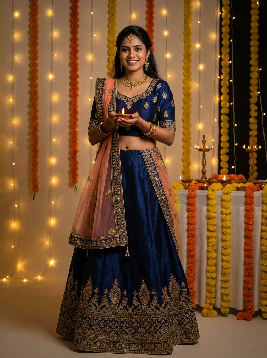 A model standing near a beautifully decorated Diwali backdrop with hanging lights, flowers, and diyas, exuding the festive spirit in a traditional dress.