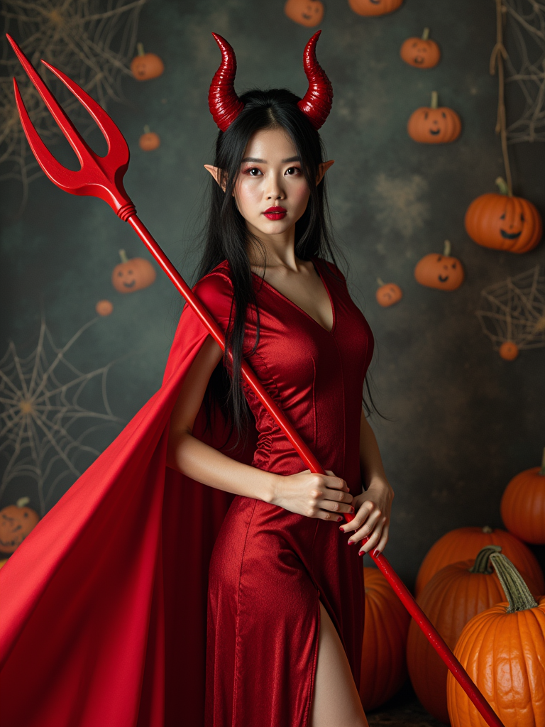 A model wearing a classic red devil costume with devil horns, a red cape, and holding a trident. The backdrop includes pumpkins, spider webs, and a spooky night scene.