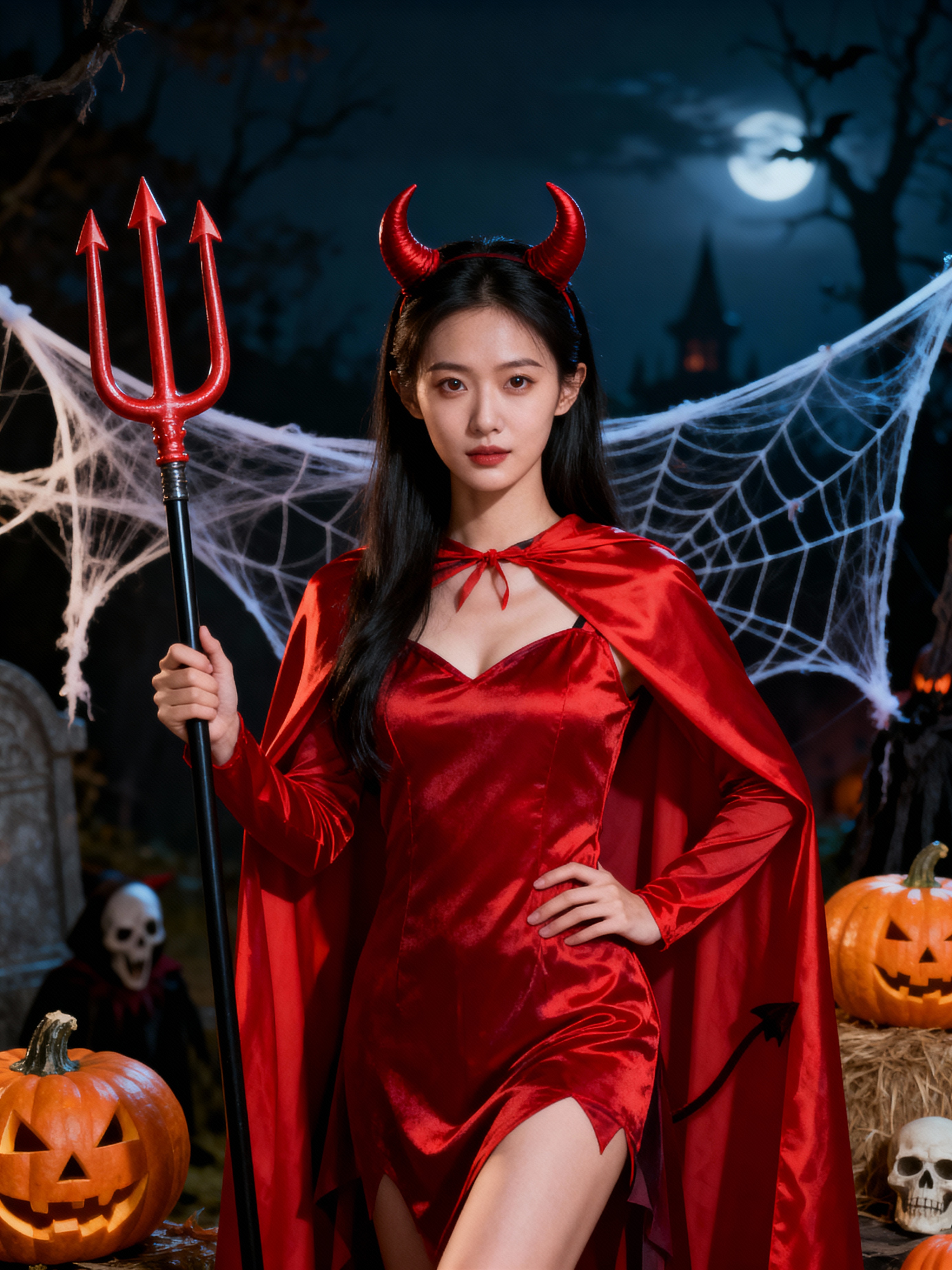 A model wearing a classic red devil costume with devil horns, a red cape, and holding a trident. The backdrop includes pumpkins, spider webs, and a spooky night scene.