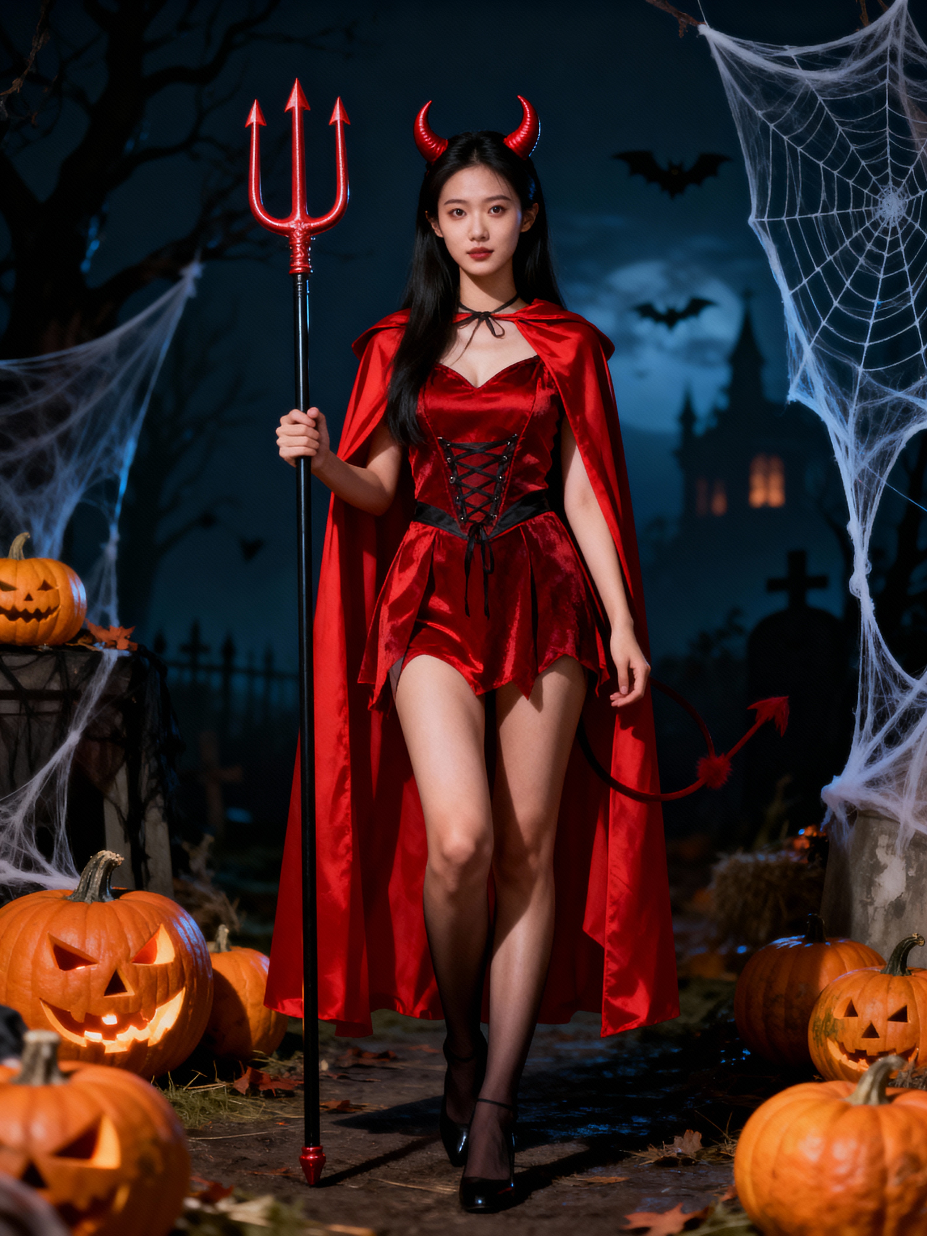 A model wearing a classic red devil costume with devil horns, a red cape, and holding a trident. The backdrop includes pumpkins, spider webs, and a spooky night scene.