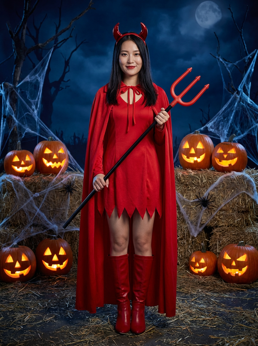 A model wearing a classic red devil costume with devil horns, a red cape, and holding a trident. The backdrop includes pumpkins, spider webs, and a spooky night scene.
