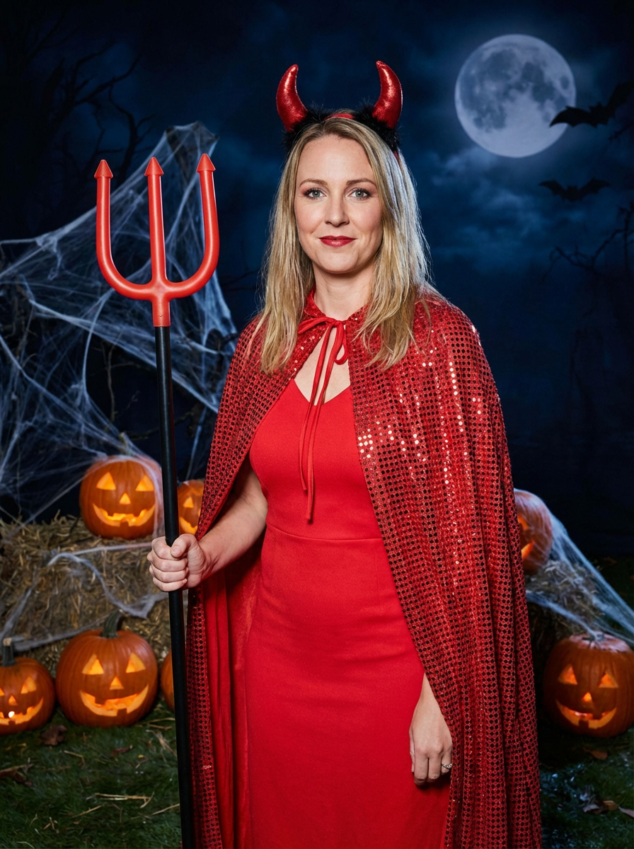 A model wearing a classic red devil costume with devil horns, a red cape, and holding a trident. The backdrop includes pumpkins, spider webs, and a spooky night scene.