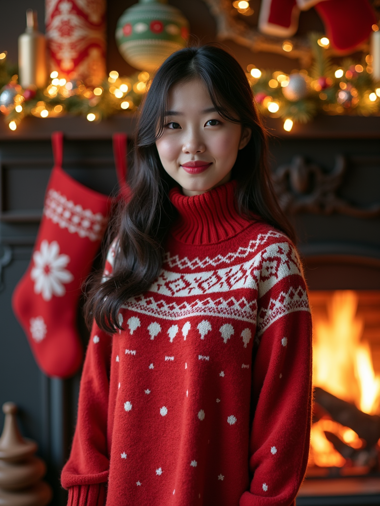 A model wearing a cozy Christmas sweater, standing by the fireplace with stockings and holiday decorations.