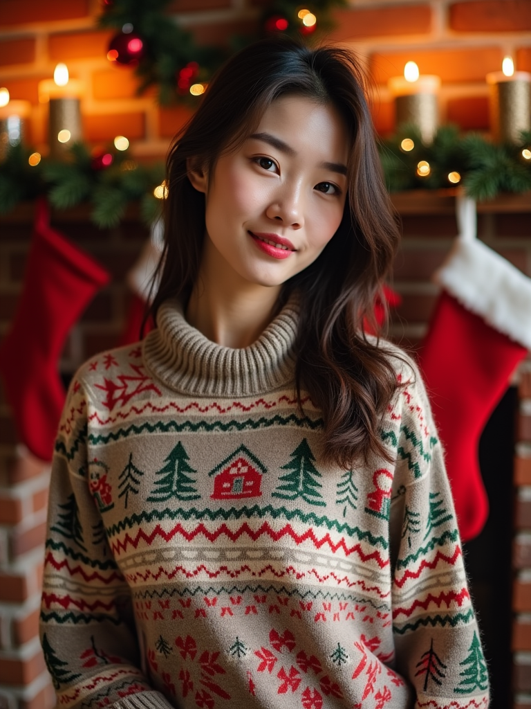 A model wearing a cozy Christmas sweater, standing by the fireplace with stockings and holiday decorations.